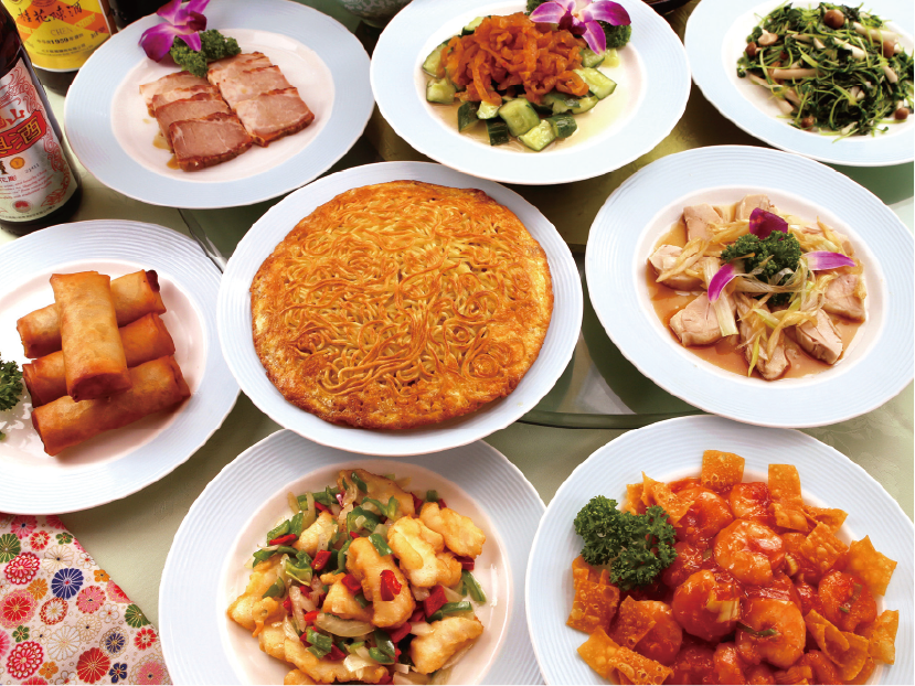 蒸し鶏肉の冷菜/上海風クラゲ/チャーシュー/海老チリソース炒め/イカと塩胡椒の炒め/小籠包/春巻/豆苗としめじの炒め/梅蘭焼きそば/杏仁豆腐/飲み放題120分(L.O.30分前)