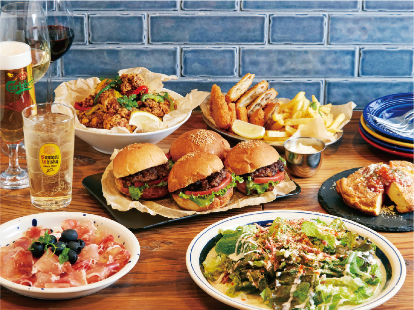 サラミ入りシーザーサラダ/生ハム&ブラックオリーブ/トルティージャ~スペイン風オムレツ~/フィッシュアンドチップス~タルタルソース~/特製から揚げ~ガーリック漬け込み~/ハンバーガー(ミニ)/飲み放題(L.O.30分前)
