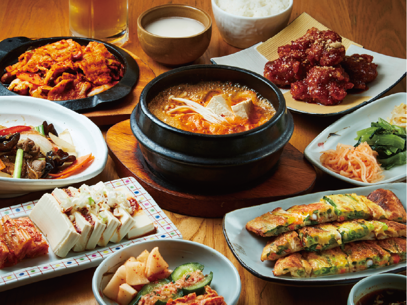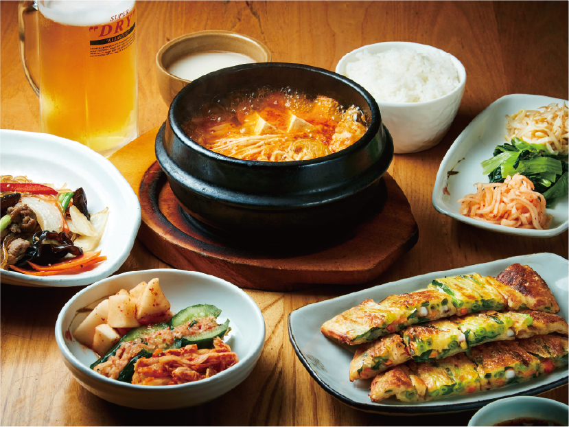 キムチ盛合せ/三色ナムル/チャプチェ/ヤンニョムチキン/プルコギ/豆腐サラダ/パチヂミ/プデチゲorコプチャンチゲ/120分飲み放題(L.O.30分前)