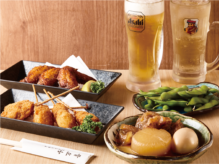 おすすめ小鉢3種/鶏の唐揚げ/焼き鳥串/月見つくね/鶏すき鍋or鶏の水炊き/〆のラーメンor雑炊/飲み放題(L.O.30分前)