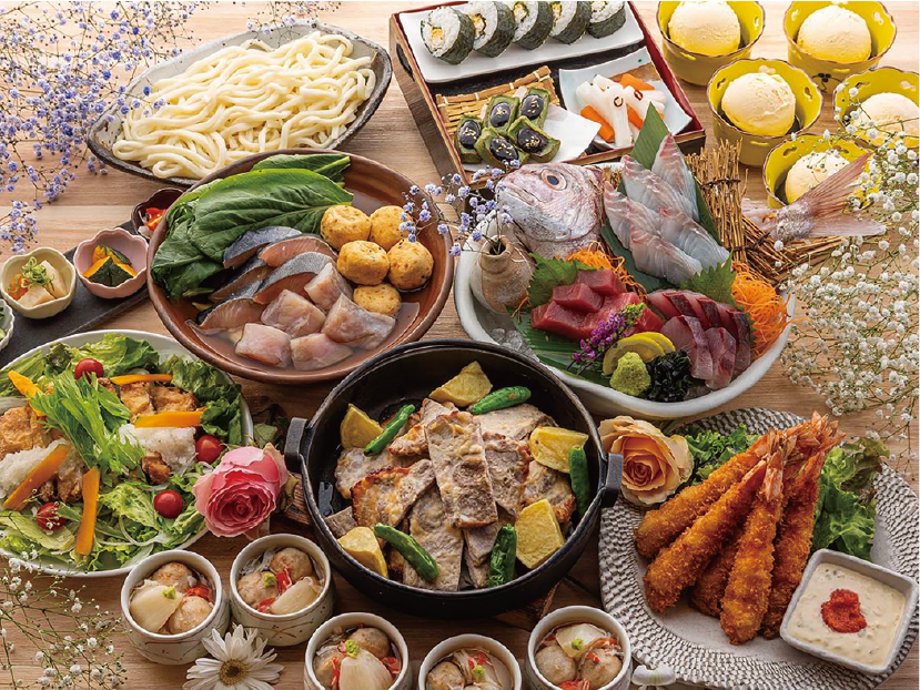 本日のかご盛3種/鯛の姿造りが入った豪華舟盛り合わせ/炙りカツオの塩たたき/明石だこの炭板焼き/大根とハリハリのカリカリちりめんサラダ/蒸し鶏の香味ねぎ油/国産ホルモンのピリ辛焼肉炒め/本日のカマ焼き or 北海道産縞ホッケ炙り焼き/ミニぶっかけ蕎麦/飲み放題90分