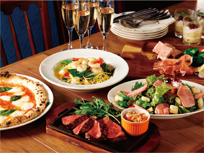 自慢のイタリアンタパス5種盛り合わせ/シーザーサラダ/ピッツァイオーロ特製本格ナポリピッツァ/厳選牛赤身肉のグリルステーキ〜フライドポテト添え~/本日のシェフのおまかせパスタ/食後のデザート/飲み放題(L.O.30分前)