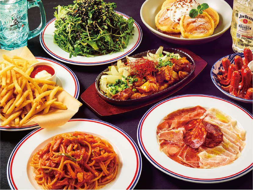 生ハム3種盛り合わせ/豆苗とパリパリわかめのチョレギサラダ/つまみに最高なタイプのフライドポテト/タコさんウインナー/鉄板!味噌焼き牛ホルモン~鬼赤ダレ添え~/締めのナポリタン/メープルスフレパンケーキ/飲み放題(L.O.30分前)