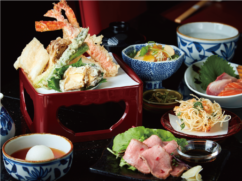 付出し/サラダ/お造り2種盛り/季節の特選天ぷら10品/ローストビーフ/ご飯又は粥/味噌汁/香物