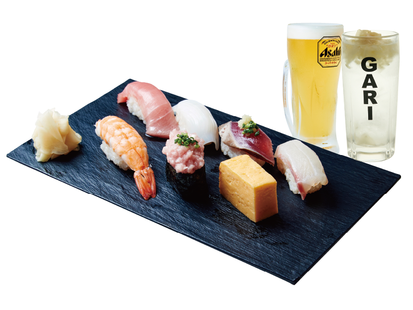 (中トロ/イカ/かつお/エビ/ネギトロ軍艦/本日のおすすめ鮮魚/切玉子)