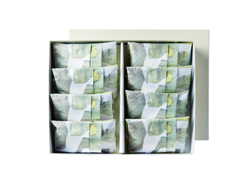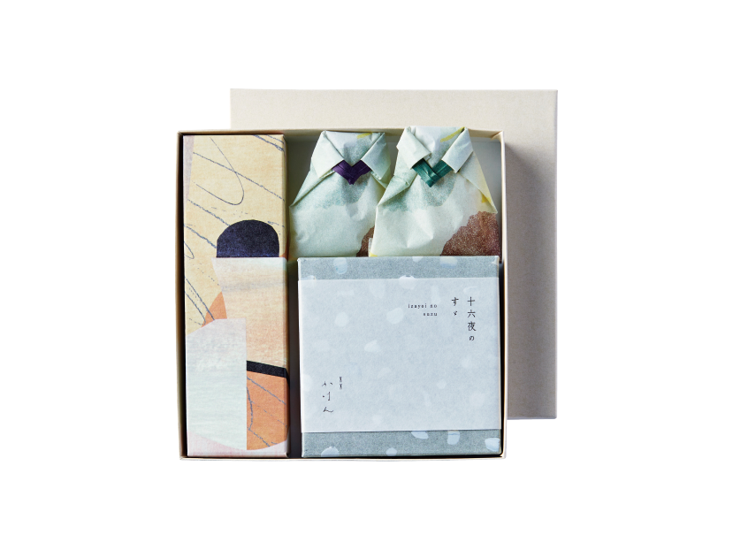 洋酒と果実を使用した羊羹「ようよう」と上品な風味でさらりとしたくちどけが特徴の和三盆「十六夜のすゞ」、雨粒のようなまるくて愛らしいグラッセゼリー「円雨」の入ったお詰め合わせです。